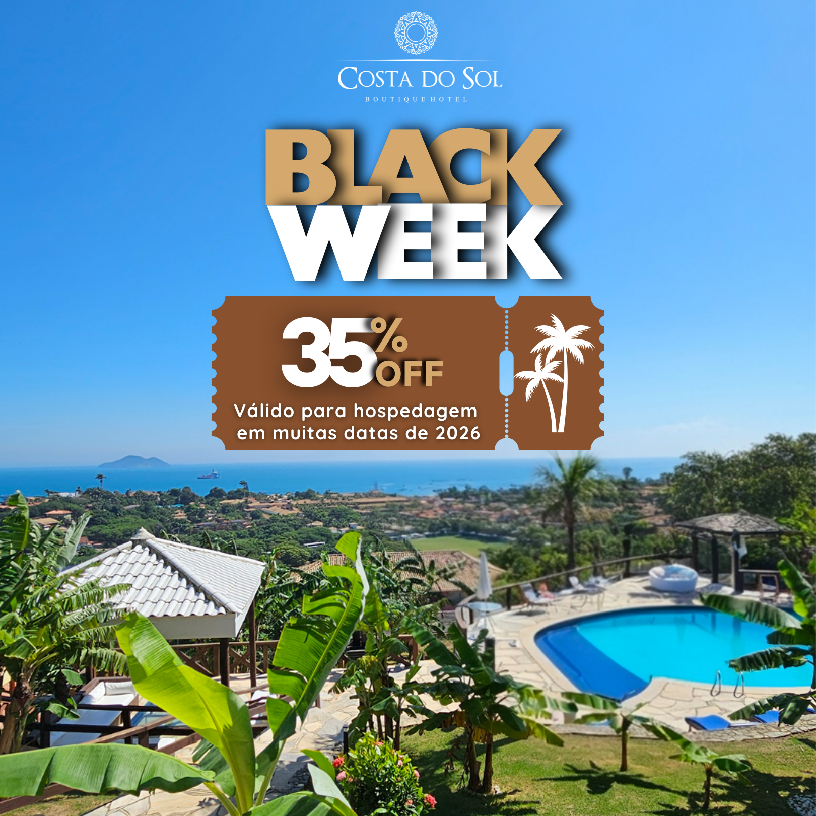 A maior campanha do ano começou. A Black Week do Costa do Sol está com um super desconto de 35% para você aproveitar o Natal de 2025 com todo o conforto e encanto em Búzios, e também planejar suas férias de 2026. A promoção já está valendo, mas o quanto antes você reservar, mais chances têm de encontrar disponibilidade para o período que deseja vivenciar esse sonho de relaxar com vista pro mar no Costa do Sol Boutique Hotel. Além desse super desconto, você ainda tem parcelamento sem juros do seu pacote de hospedagem, e um delicioso café da manhã grátis durante todos os dias de hospedagem. Não perca essa oportunidade única! Reserve online clicando aqui .